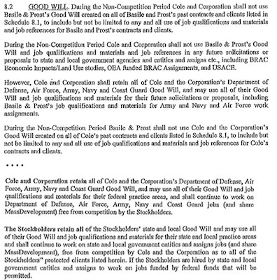 There was also an addendum on “goodwill” that describing how the parties could use the other’s “goodwill” in certain fields, e.g., Cole could use Basile’s and Prost’s goodwill for military contracts:
